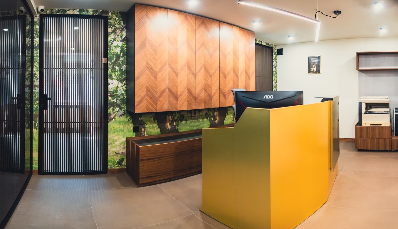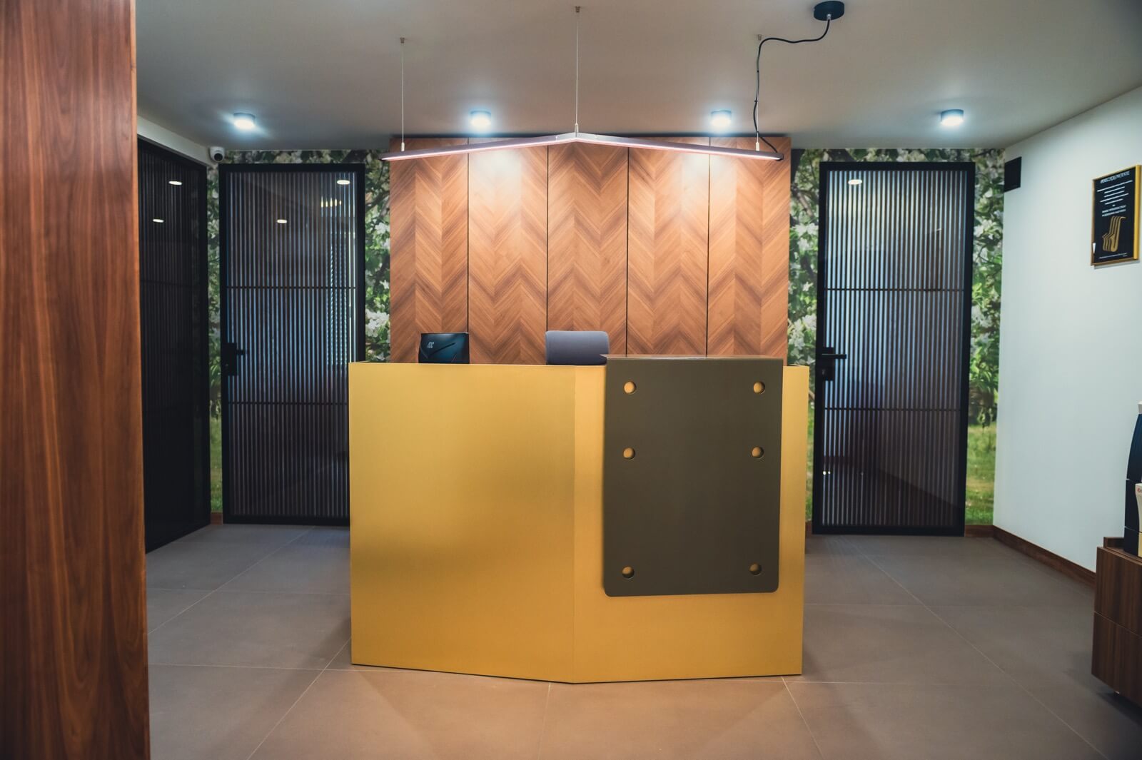 Mamy wielu dużych klientów z branży finansowej, ale z radością podejmujemy się realizacji lokalnych nieszablonowych projektów. W Józefowie kluczową rolę odegrały zieleń i inspiracje lokalną naturą. Parter to przyjazna przestrzeń dla klientów, z ciepłymi kolorami i rozwiązaniami, które dbają o komfort i prywatność. Na piętrze – elegancja i charakter. Orzech, czerń i detale, które podkreślają rangę spotkań i rozmów. Wnętrza zostały zaprojektowane przez Pracownię Fresko, arch. Leszek Juchkiewicz.