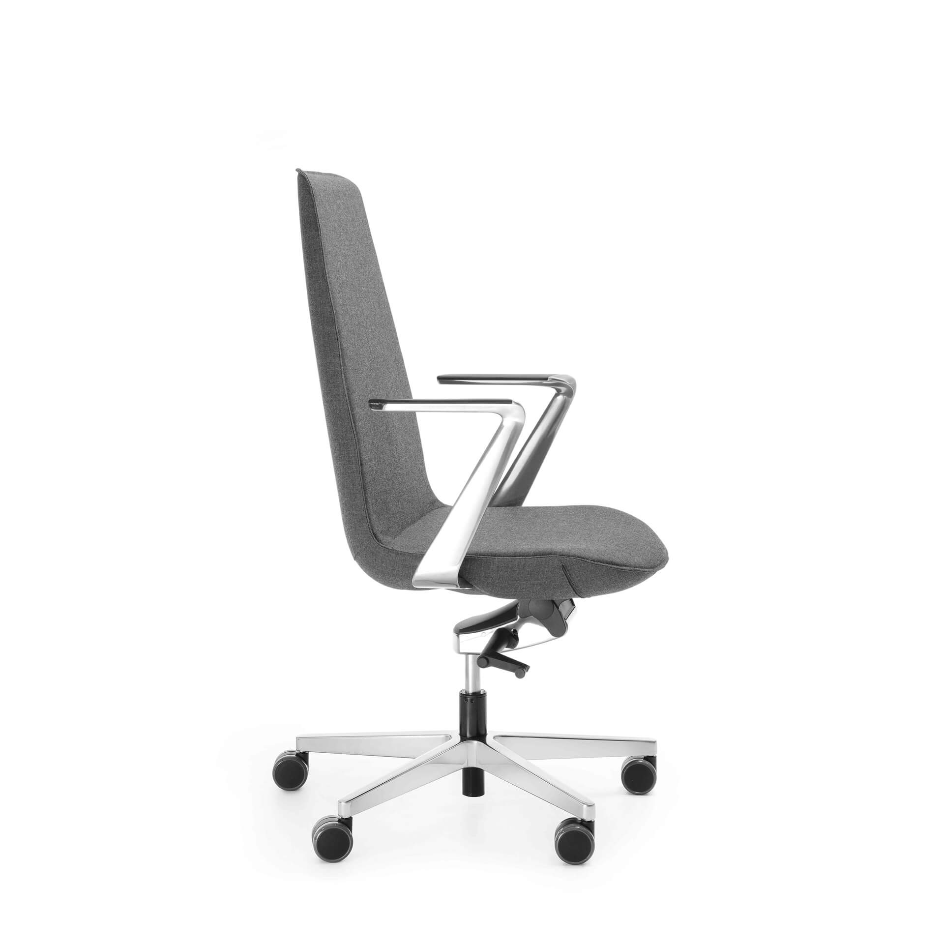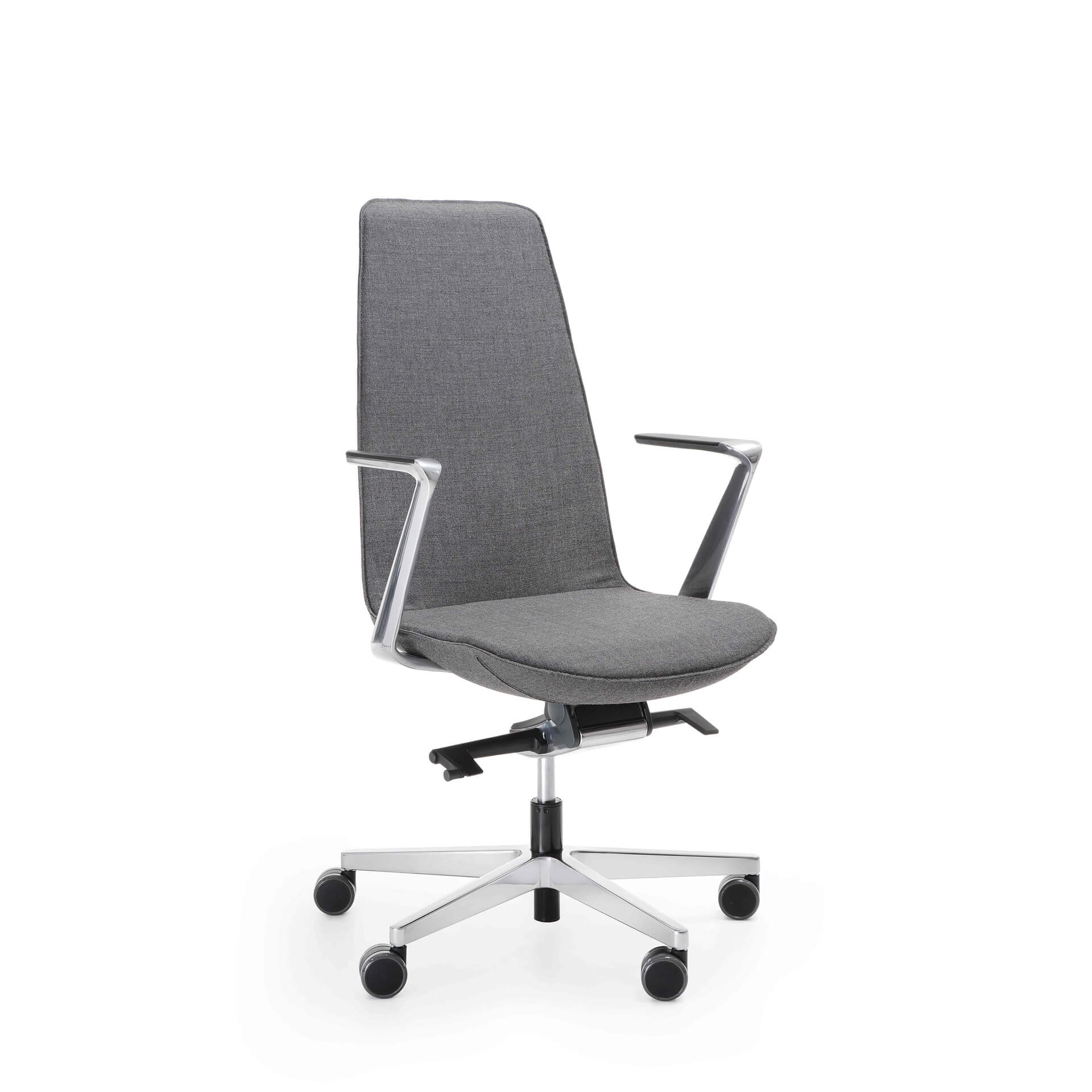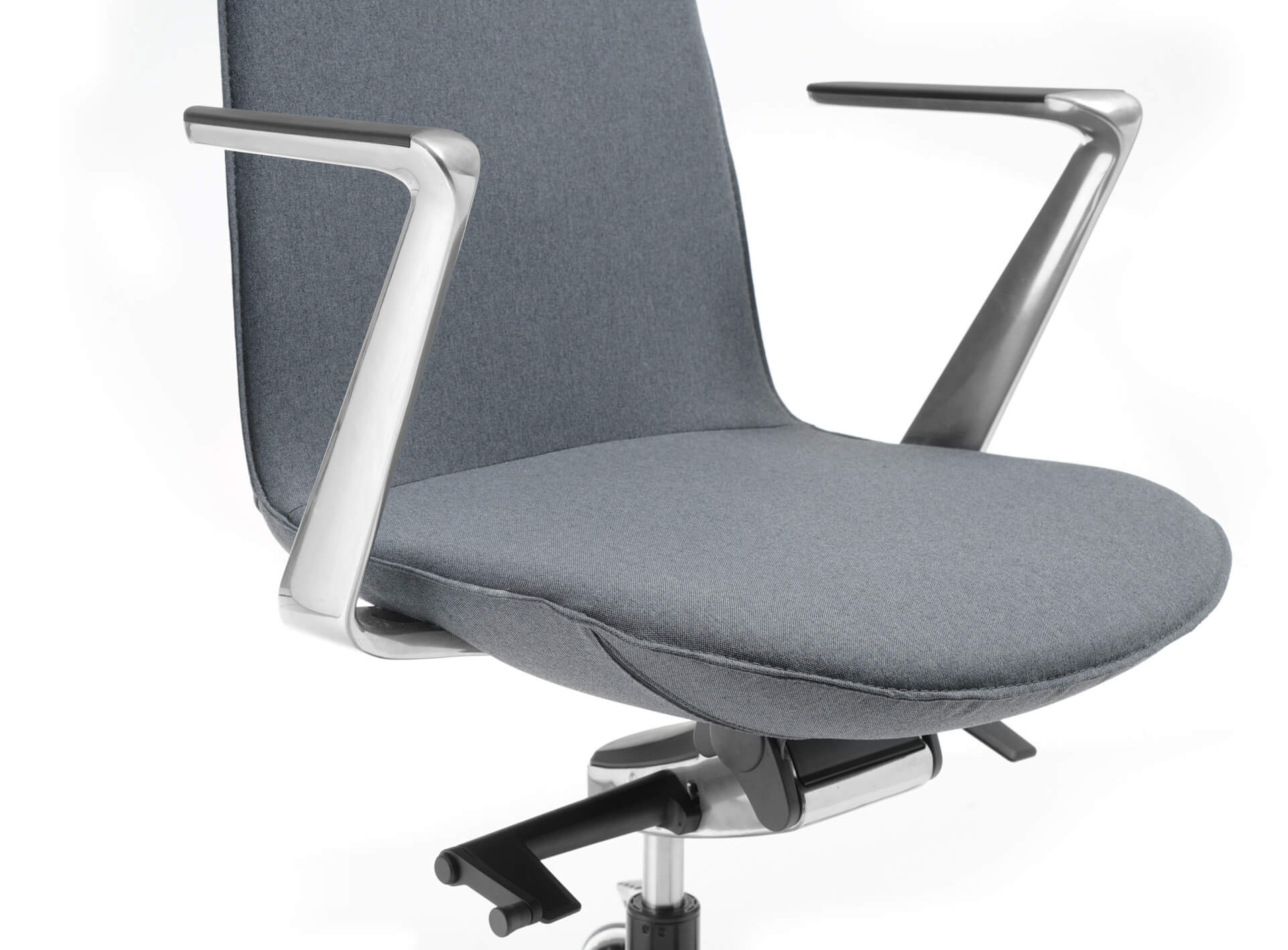 Tapicerowany fotel w różnych wersjach podstawy – od obrotowego ze zintegrowanym zagłówkiem i podłokietnikami z polerowanego aluminium po niższe na stelażu prętowym lub krzyżaku. Świetny wszędzie tam, gdzie zależy nam na podkreśleniu prestiżu miejsca – główne sale konferencyjne, gabinety, strefy recepcji. W wersjach na nogach drewnianych lub prostych metalowych sprawdzi się również w strefach chillout czy aneksach kuchennych. Do wyboru różne wersje i konfiguracje oraz szeroka gama kolorystyczna tapicerek.
